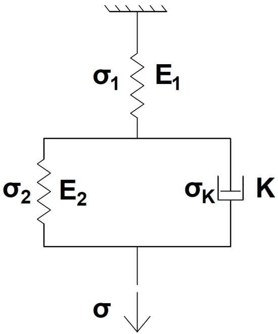 In this research, we used the three-element model, which is based on the Kelvin–Voigt model. This model is described in classical creep theory [21]. The appearance of the model is shown in Figure 4.