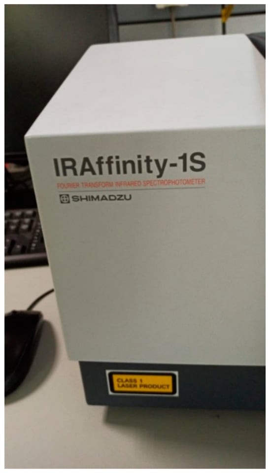 In this research, FTIR spectrophotometer IRAffinity-1S was used (Figure 5). The manufacturer is Shimadzu, Kyoto, Japan. IRAffinity-1S is a spectrometer with wavenumber range from 7800 to 350 cm−1 and a spectral resolution from 0.5 to 16 cm−1.