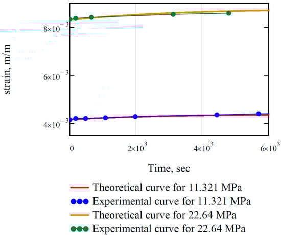 Experimental creep curves were imported into the Mathcad program, which created a system of equations (see (10)), where strain, time and elastic modulus are known parameters and are unknown. The elastic modulus was obtained in previous research [11,24] and checked again in this one at initial loading. By equalizing the theoretical and experimental strain values at given times, the program numerically approximated them and came up with , which provided convergence of theoretical and experimental curves.