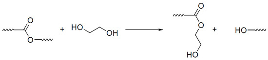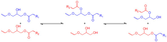 The first paper dedicated to vitrimers [42] was an investigation of materials based on the transesterification mechanism presented in Figure 1. Transesterification is a classical reaction of organic chemistry, which is widely known as an equilibrium reaction in which an ester and an alcohol are converted into another ester and another alcohol through the exchange of alkoxy substituents.