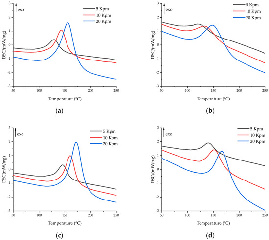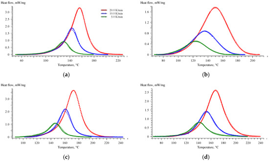 DSC curves of uncured compositions at heating rates of 5 (black), 10 (red), and 20 (blue) K/min for (a) EP, (b) EP-G, (c) EP-Z, and (d) EP-GZ.