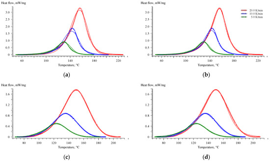 The results of fitting using the Cnm model are presented in Figure 6 and Table 4. Here, is the pre-exponential factor for the non-catalyzed reaction , and is the pre-exponential factor for the catalyzed path . It should be noted that the chosen model (Equation (10)) has an important advantage over the autocatalytic model (5). The constant in the model (Equation (10)), which is the ratio of the pre-exponential factors of two competing reactions with assumed equal activation energies, shows how many times the rate constant of the autocatalytic reaction exceeds the rate constant of the n-th order reaction.