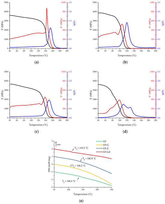 DMA curves of cured compositions: (a) EP, (b) EP-G, (c) EP-Z, and (d) EP-GZ. (e) Comparison of DSC curves of cured compositions obtained in the scanning mode.