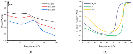 The gel points of the compositions at a heating rate of 5 °C/min were calculated from the viscosity data as the intersection of the abscissa line and the tangent to the viscosity curve at the point of maximum viscosity increase rate. The gel point of EP was at 154 °C. The gel point of the EP-G was slightly lower (at 153 °C) because of the acceleration of the curing process by the free hydroxyl groups of glycerol. Although it was previously shown that with the introduction of glycerol into the system the curing reaction is accelerated, the fact that the gelation point remained almost unchanged can be explained as follows. Apparently, with the introduction of glycerol, a more flexible network is formed, which in turn leads to an increase in the time interval between the onset of the reaction and the onset of loss of fluidity for the system with glycerin.