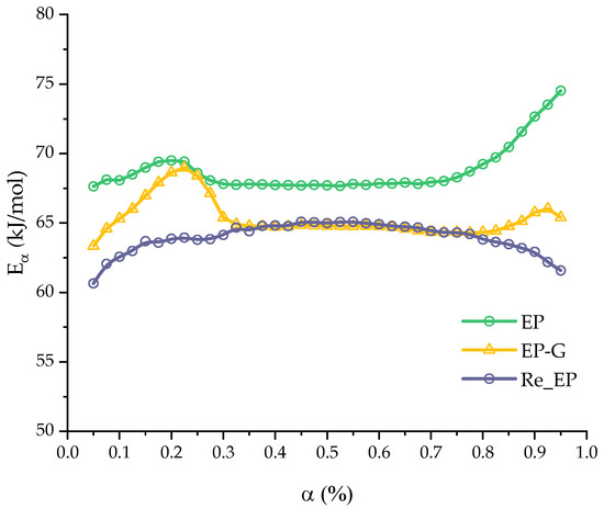The curing process of the EP, EP-G, and EP-GZ compositions demonstrates a slight variation of the activation energy with the extent of conversion in the range of . The constancy of the dependence of the activation energy in a certain region indicates that the curing process here is probably controlled by a single reaction step.