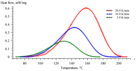 A differential scanning calorimeter DSC 214 Polyma (Netzsch, Selb, Germany) was employed for monitoring thermal effects. In order to study a process of curing, several heating rates 5, 10, and 20 K/min were used, and the data was analyzed according to ISO 11357-5:2013 [56]. Glass transition temperatures of cured samples were determined in accordance with ISO 11357-2:2020 [57] at a heating rate of 10 K/min. All tests were performed in a nitrogen atmosphere at a flow rate of 40 mL/min with sensitivity and temperature calibrations applied. An aluminum Concavus® pan with a pierced lid with a pinhole size of approximately 0.7 mm was used. The weight of samples ranged from 5 to 10 mg. For data processing, Proteus Thermal Analysis version 8.0.2 software (Netzsch, Selb, Germany) was used. As a result of every measurement, several key points were defined: onset temperature (Tonset), defined as the intersection of two tangent lines to the DSC curve at the point before peak started and the point with maximum peak slope; peak temperature (Tpeak), defined as peak maximum; peak end temperature (Tend), defined as an intersection of two tangent lines to the DSC curve at the point with maximum peak slope and the point after peak ended; reaction enthalpy (ΔH), defined as peak area; and Tg middle, defined as inflection point of DSC curve.