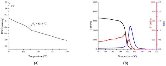 DSC (a) and DMA (b) curves of cured Re_EP composition in the scanning mode.