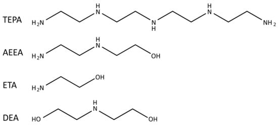 Molecular structures of the devulcanizing agents, including tetraethylenepentamine (TEPA), hydroxyethyl ethylenediamine (AEEA), ethanolamine (ETA), and diethanol amine (DEA).
