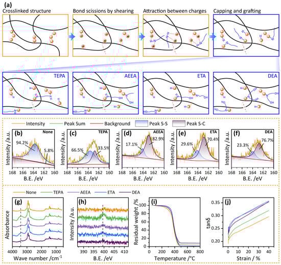 (a) Scheme of mechano–chemical devulcanization of waste rubbers using different devulcanizing agents. (b–f) X-ray photoelectron spectroscopy (XPS) results of S 2p for reclaimed rubbers (RRs) with no, tetraethylenepentamine (TEPA), hydroxyethyl ethylenediamine (AEEA), ethanolamine (ETA), and diethanol amine (DEA) as the devulcanizing agents; (g) Fourier transform infrared spectroscopy (FTIR) results; (h) X-ray photoelectron spectroscopy (XPS) results for N 1s; (i) variations of residual weight in thermogravimetric (TG) curves; and (j) damping factor as a function of strain in rubber process analyzer (RPA) results.