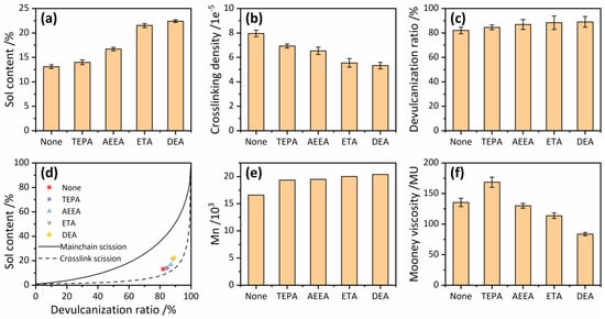 Figure 3f displays the Mooney viscosity of rubber samples treated with different devulcanizing agents. It is observed that the addition of TEPA increased the Mooney viscosity while the addition of AEEA, ETA, and DEA reduced it. The increase in Mooney viscosity with TEPA may be due to the fact that different amine groups in the same molecular chain can be grafted onto different rubber molecular chains, forming a crosslinked structure with TEPA as the crosslink node. The decrease in Mooney viscosity with AEEA, ETA, and DEA is mainly attributed to the enhanced devulcanization degree. Additionally, alcoholic amines also have a plasticizing effect, which further reduces the Mooney viscosity of rubber samples. Therefore, when considering devulcanization effectiveness, alcohol–amine devulcanizing agents are superior to TEPA.