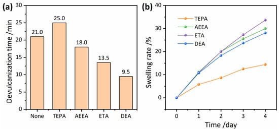 The reduction of devulcanization time using alcohol–amine devulcanizing agents is primarily attributed to their plasticizing effect, which enables them to rapidly disperse and penetrate the rubber matrix, thus accelerating the devulcanization process. To verify this hypothesis, swelling experiments were conducted on vulcanized NR with four different devulcanizing agents, and the results are shown in Figure 4b. It was observed that the swelling rate of the vulcanized NR in AEEA, ETA, and DEA was significantly higher than that in TEPA, indicating that alcohol–amine compounds have a higher impregnation rate into vulcanized NR than TEPA, allowing them to diffuse more quickly and speed up the devulcanization process. For the three alcohol–amine compounds, ETA had the highest infiltration efficiency, followed by AEEA and DEA.