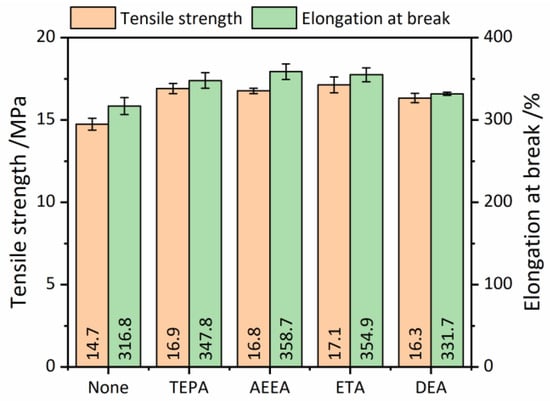 Figure 5 shows the tensile strength and elongation at break of the vulcanized RRs obtained by using different devulcanizing agents. When no devulcanizing agent was added, the tensile strength of the RRs was 14.7 MPa, and the elongation at break was 316.8%. Adding the devulcanizing agent can enhance both the tensile strength and the elongation at break. The simultaneous increase in tensile strength and elongation at break is attributed to the devulcanization effect of the devulcanizing agents, which restores the crosslinked network structure of rubbers to a linear structure so that the molecular chains can be re-crosslinked with each other during the re-vulcanization process. Among different devulcanizing agents, ETA achieved the best tensile properties of RRs, that is, the tensile strength of 17.1 MPa and the elongation at break of 354.9%. This value of tensile strength is much higher than that found in other work, such as 12.90 MPa [] and 11.00 MPa [], which are relatively high tensile strengths for the RRs we found in the literature.