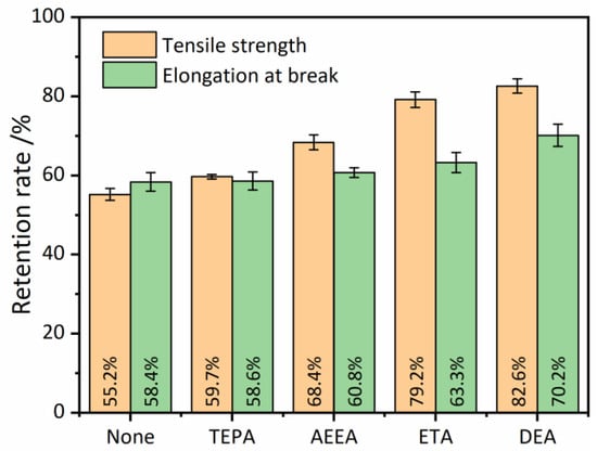 The anti-aging properties of vulcanized RRs were characterized by comparing their tensile properties before and after aging, as shown in Figure 6. When no devulcanizing agent was added, the retention rates of the tensile strength and elongation at break of the vulcanized RR were 55.2% and 58.4%, respectively. The addition of TEPA slightly increased these retention rates to 59.7% and 58.6%, respectively. When alcohol–amine devulcanizing agents were added, the retention rates of both tensile strength and elongation at break were significantly improved. The best aging performance was achieved by adding DEA, which resulted in retention rates of 82.6% and 70.2%, respectively, for tensile strength and elongation at break. These results suggest that the anti-aging performance of RR can be improved with the increase in hydroxyl content, as evidenced by the introduction of hydroxyl groups. However, it is important to note that the effect of hydroxyl groups on aging performance has not been previously reported in the literature, and further research is needed to fully understand this phenomenon.