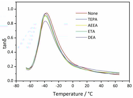 In the RPA result in Figure 2j, the dumping factor of the RR without using the devulcanizing agents is lower than that using TEPA, and the dumping factor of the RR using TEPA is lower than those using AEEA, ETA, and DEA. The increase in the dumping factor after adding the devulcanizing agents is due to the breakage of crosslink bonds and the capping of the sulfur groups by the amine groups in the devulcanizing agent, which improves the mobility of the rubber chains. For the four cases using the devulcanizing agents, the TEPA case shows a lower dumping factor than the other cases. This may be because different amines in the same molecular chain of TEPA are grafted into different rubber molecular chains, forming a crosslinking structure and thus decreasing the dumping factor. The results of FTIR, TG, and RPA indicate that the amine groups in the devulcanizing agents can react with -S+ and -S− and block their activity, finally introducing hydroxyl groups into the molecular chains of RRs.