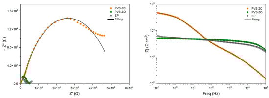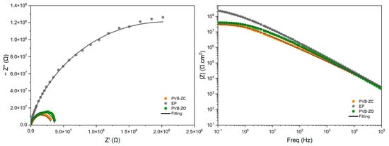 Figure 4 illustrates the barrier properties of the coatings at 30 min of immersion. PVB-ZO demonstrates the highest barrier performance, while PVB-ZC and EP exhibit similar performance. However, PVB-ZC has the highest barrier performance after 100 days (Figure 5) and the |Z|0.1Hz value increases from 104 to 104.7. In contrast, both PVB-ZO and EP experience a continuous decrease in barrier properties, reaching a similar level after 100 days. This can be due to the absence of active corrosion inhibitors in their formulations, which would typically form a protective layer over the exposed metal surface. However, PVB-ZO incorporates ZnO in its formulation, enhancing the primer’s toughness and water resistance [].