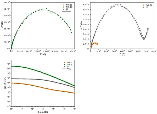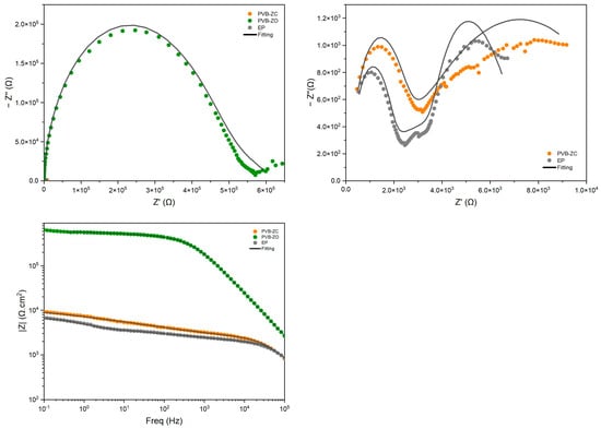 After 100 days (Figure 3), it was observed that PVB-ZO had the highest barrier properties and adequate corrosion protection, while PVB-ZC exhibited the lowest performance, as was the case at 30 min. Therefore, it can be concluded that PVB-ZC is more permeable than the other two primers, and that PVB-ZO has more resistance to water penetration, maintaining its barrier properties. By examining the Nyquist plot of EP at 100 days, it is noted that there is an inclined line at approx. 45° in the low-frequency region. This is the Warburg diffusion, depicting the diffusion process at the coating–metal interface []. Although EP has a higher crosslinking density and a higher |Z|0.1Hz at the beginning, the value gradually decreased, meaning that the coating absorbs the electrolyte continuously.