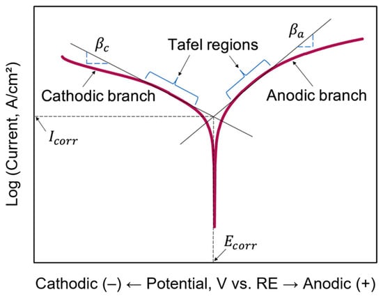 The potentiodynamic polarization test is another electrochemical test carried out in this study, which gives a better understanding of the corrosion process by measuring the thermodynamics and kinetics of corrosion. Given that the corrosion process involves both cathodic (i.e., oxygen reduction reaction) and anodic reactions (i.e., metal oxidation), which can be accelerated by scanning the sample over a narrow potential range while monitoring the current. By extrapolating the cathodic and anodic slopes in the linear regions of the Tafel plot, the corrosion potential (Ecorr) and corrosion current density (Icorr) can be determined (Figure 6). As a result, PDP tests can provide insights into the susceptibility of coated metals to corrosion and predict the long-term damage effects. Ecorr indicates the level of protective ability of the coating towards the substrate, while Icorr signifies the rate of electrolyte penetration into the coating. Usually, a high Ecorr value and a low Icorr value is preferred for good corrosion resistance, which indicates less corrosion tendency and improved corrosion resistance, and a delay in the electrolyte uptake at the coating–metal interface, respectively [].