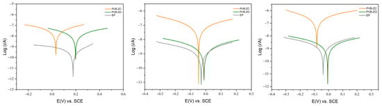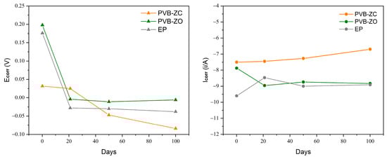 The development of the resistive region at low frequencies can indicate electrolyte diffusion and loss of coating–metal interface adhesion, which ultimately leads to corrosion underneath the coating. The low-frequency impedance modulus (|Z|0.1Hz) is a good indicator of the coating’s performance over time. Based on the |Z|0.1Hz value of PVB-ZO (the low-frequency region is a representation of the coating–substrate interface [,]), its impedance value remains relatively constant over 100 days of immersion. In addition, the PDP test also confirms that PVB-ZO exhibits the highest level of substrate protection with a low electrolyte penetration rate through the primer film.