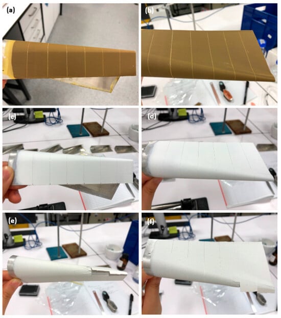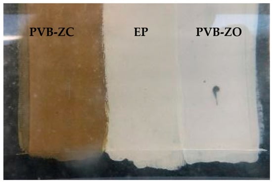 Figure 12 illustrates the results of the conical mandrel bend test. Notably, PVB-ZC exhibited no cracking even in the vicinity of vertical artificial scratches, demonstrating excellent flexibility. Similarly, PVB-ZO displayed good flexibility during bending, showing no signs of cracking. However, EP exhibited cracking upon bending, and two out of three replicates exhibited peeling from the substrate. Furthermore, a section of EP at the small end of the conical diameter detached completely.