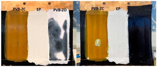 On the other hand, the electrolysis result indicates that EP has the best performance at resisting cathodic disbondment around the artificial scratch. However, this could be due to the thickness of the EP being 200 µm, which is much thicker compared with PVB-based primers. As the bronze plate was prepared by brush, it is hard to control the primer at the same thickness. In addition, most epoxy primers only work at this level of thickness or greater for effective corrosion protection.