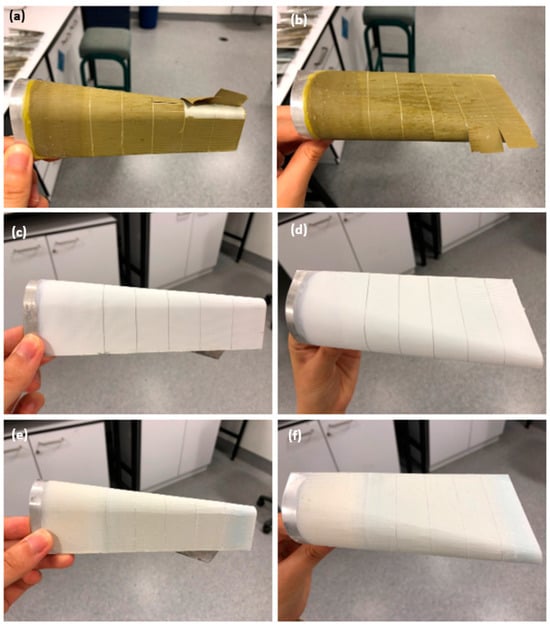 Conical mandrel bend results before immersion: (a,b) PVB-ZC, (c,d) PVB-ZO, and (e,f) EP.