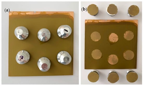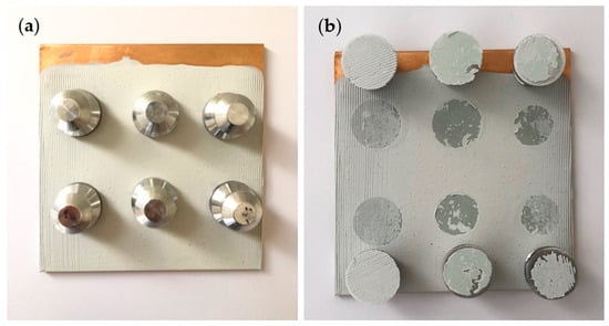 The pull-off adhesion test was conducted to evaluate the adhesion of primer to the substrate. The fracture interface was examined to determine whether failure was adhesive or cohesive in nature. Adhesive failure indicates the coating failure occurs at the coating-metal interface, while cohesive failure suggests the failure occurs within the coating. Adhesion is a crucial property/prerequisite for primer performance, as even excellent corrosion resistance is rendered ineffective if the primer does not adhere to the substrate well []. Figure 14, Figure 15 and Figure 16 illustrate the appearance of the pull-off adhesion test for all three primers. Table 5 shows the average pull-off adhesion results for each primer.