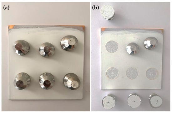 The pull-off adhesion test of EP before (a) and after (b) pulling.