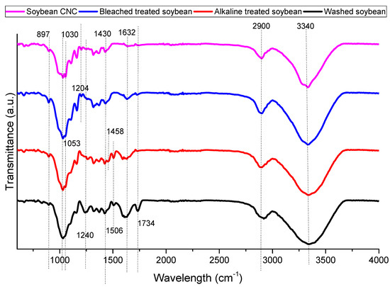 The aromatic C=C stretching of lignin can be attributed to the band at 1458 cm−1 [28]. This band diminishes in bleach-treated soybean and soybean CNC as compared to alkaline-treated soybean indicating the removal of lignin. Also related to lignin is the band at 1506 cm−1 [30]. The disappearance of this band in bleach-treated soybean and soybean CNC as compared to washed soybean and alkaline-treated soybean also indicated that the bleaching treatment removed the lignin components in the soybean stover samples. The C=O stretching of the lateral chain of lignin may be related to the band at 1632 cm−1 [31]. The disappearance of this band in soybean CNC indicated its absence of lignin.