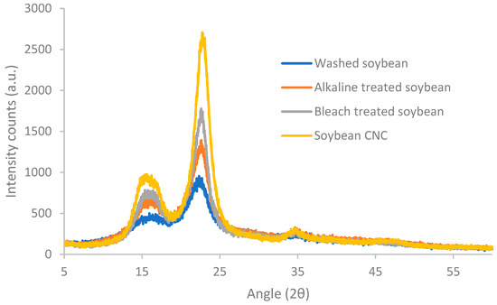 Diffraction patterns of soybean stover samples following different treatments are shown in Figure 2. After washing, soybean stover showed three reflection peaks at 2θ = 16.8°, 22.3° and 34.9°. These three peaks are typical cellulose type I crystals [33]. The peaks at 16.8°, 22.3°, and 34.9° correspond to the (101), (002), and (040) diffraction planes, respectively [33]. As shown in Table 1, soybean stover, after washing, displays a crystallinity index (59%) which is similar to that of soybean straw (56%) [34]. With consecutive treatments, the peaks in the XRD pattern appear narrower with higher intensity counts. Following the elimination of hemicellulose and lignin through alkaline and bleaching treatments, an increase in the crystallinity index to 69–73% was observed. A further increase in crystallinity values was observed after acid hydrolysis (82%), during which amorphous regions of cellulose were removed. Similar trends were observed by Neto et al. [35]. Specifically, the crystallinity index rose from 26% to 67% after alkaline and bleaching treatment, and the crystallinity index increased further to 73.5% following sulfuric acid hydrolysis [35].