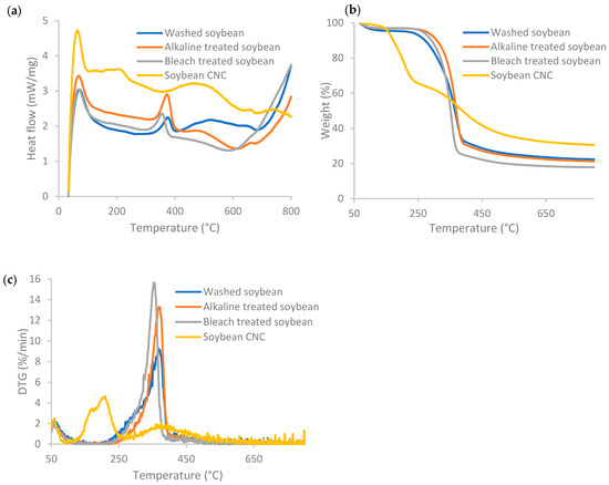 Figure 3 displays the DSC, TG, and DTG profiles of soybean stover samples following each treatment. Weight loss at temperatures below 120 °C and an exothermal peak was seen for all samples. The weight lost below ~100 °C is caused by the evaporation of residual water in the samples, which is normally below 6% of the sample mass [38]. According to the TG curves in Figure 3b, the onset decomposition temperature for soybean CNC was found to be 160 °C, which is the lowest among all the samples. The onset decomposition temperature increased from 271 °C for washed soybean stover to 324–336 °C after alkaline and bleaching treatment. The sulfate ester groups present in soybean CNC led to a decrease at which thermal degradation took place, as the sulfate ester groups required less energy to become thermally degraded [26]. The diminished thermal stability of cellulose following introduction of sulfate groups was also reported in other studies [29,39].