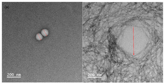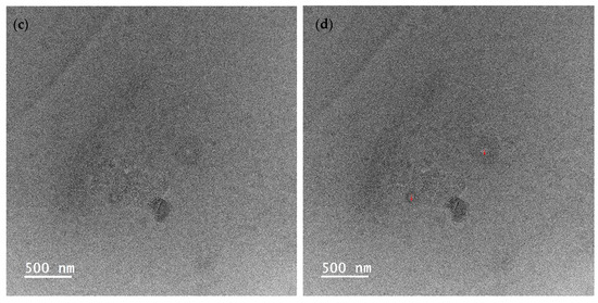 TEM images of encapsulated essential oil. (a) Essential oil encapsulated by tween 80; (b) essential oil encapsulated by soybean CNC in the presence of NaCl (i.e., salted CNC); (c,d) essential oil encapsulated by Tween 80 and salted CNC without and with marks. Note: The red marks represented the diameter of the emulsion droplets.