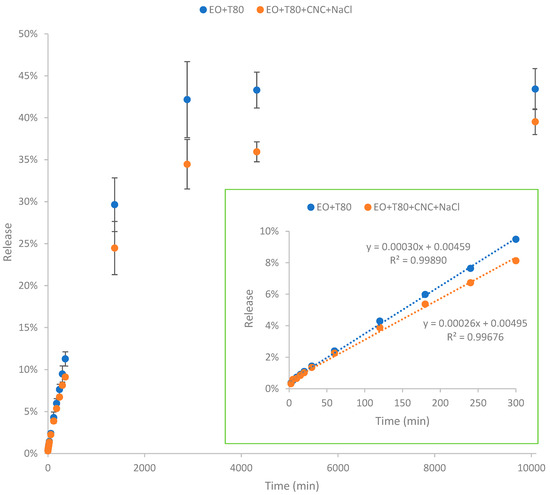 Release profile of nanoencapsulated essential oil over time. EO + T80 refers to encapsulation of essential oil by Tween 80; EO + T80 + CNC + NaCl refers to encapsulation of essential oil by Tween 80 and salted CNC.
