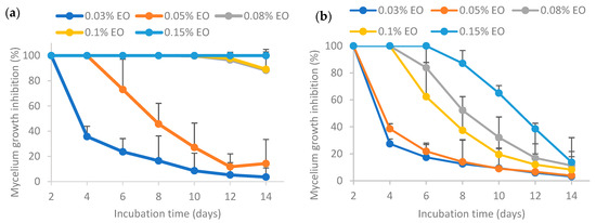 In vitro growth inhibition of A. flavus was performed using both pure and encapsulated essential oil (including fresh emulsion and 30-day-old emulsion) [25]. As the growth medium, sterile potato dextrose agar (PDA) containing 0.1% (v/v) Tween 80 was prepared. The parent emulsion (prepared as above) was diluted with PDA medium (at 55 °C) to reach certain EO concentrations (0.03%, 0.05%, 0.08%, 0.10%, and 0.15%). The resulting emulsion containing media were mixed well, then divided into Petri plates immediately. Plates were allowed to dry in the biosafety cabinet. Once plates were dried, 10 µL of 105 conidia/mL spore suspension was applied to the agar surface for inoculation. The conidial suspension was prepared in sterile water and spores were scraped from two-week-old cultures. A hemocytometer was used for the counting. Following inoculation, the plates were then incubated for 14 days at 25 °C. The diameter of mycelial growth was recorded every 2 days over the 14-day time period. For each sample, four replicates were created and monitored. The antifungal activity of samples was measured using mycelium growth inhibition percentage (%MGI) as calculated below.