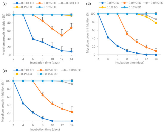 The enhanced antifungal effectiveness of EO stabilized by Tween 80 (sample (c)) or Tween 80 and salted CNC (sample (e)) compared to EO stabilized solely by salted CNC (sample (d)) could be attributed to the smaller emulsion droplet size in the former cases, as indicated in Figure 4. Currently there are contradictory findings in the literature regarding the impact of emulsion droplet size on its antimicrobial effectiveness. Some studies report that the antimicrobial activity of essential oil-loaded emulsions was affected by droplet size, with nanoemulsion having higher antimicrobial activity than the coarse emulsion [44]. Conversely, other research suggests that antimicrobial oil-loaded emulsions with varied droplet sizes (i.e., micron-size and nano-size) had the same antimicrobial efficacy [45]. Nevertheless, Terjung et al. [46] demonstrated that essential oil-loaded nanoemulsion had reduced antimicrobial efficacy against Listeria innocua and Escherichia coli C 600 as compared to macroemulsions ascribing to an elevated sequestration of antimicrobials at emulsion interfaces and a reduced solubilization within surplus Tween 80 micelles. Discrepancies in these findings may be attributed to variations in factors such as the type of antimicrobial oil tested, the specific microorganisms involved, and variations in emulsion formulation and preparation procedures.