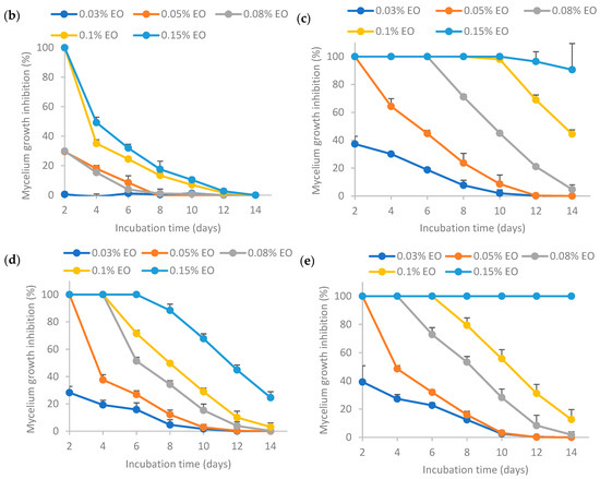 The results from Figure 7 show that higher EO concentrations resulted in higher mycelium growth inhibition (MGI) rates. In a nutshell, the MGI rates for the encapsulated essential oil aged for 30 days adhered to the following order: (c) >> (e) >> (d) >> (b), where “>>“ signifies a significantly larger difference. This trend was similar to that of the fresh emulsion as shown in Figure 4, indicating that the storage time did not influence the relative antifungal activity among the samples. The MGI rate of EO encapsulated by Tween 80 (c) was significantly higher than others, indicating that the retention of EO activity was the highest when stabilized solely by Tween 80 after 30 days storage. The MGI rate of EO encapsulated by Tween 80 and salted CNC (e) ranked the second highest, which was higher than that of EO encapsulated by salted CNC (d). The MGI rate of EO in water (b) was the lowest, as sample (b) was not stable without the presence of emulsifiers or emulsion stabilizers.