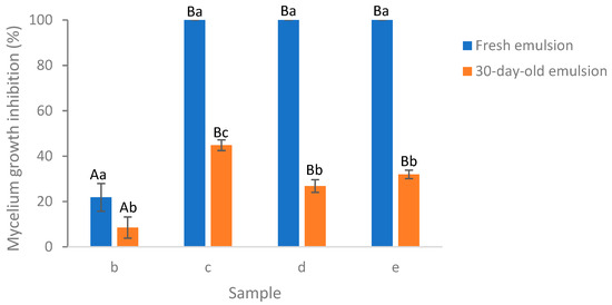 Comparison of fresh and 30-day-old emulsion containing lemongrass essential oil at 0.05% on the inhibition of Aspergillus flavus mycelium growth following a six-day incubation period on the plates. (b) Essential oil in water; (c) essential oil encapsulated by Tween 80; (d) essential oil encapsulated by soybean CNC in the presence of NaCl (i.e., salted CNC); (e) essential oil encapsulated by Tween 80 and salted CNC. The samples were labeled to match the labeling in Figure 6 and Figure 7. Samples labeled with uppercase letters showed significant differences (Duncan, p < 0.05) when compared across various emulsion samples, while samples marked with lowercase letters exhibited significant differences (Duncan, p < 0.05) when compared across different storage times.