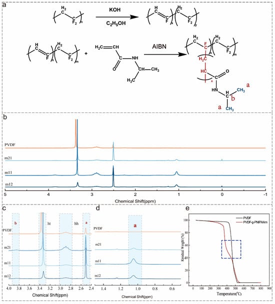 In this study, NIPAAm monomers were branched onto the hydrophobic PVDF backbone by alkali treatment to prepare the amphiphilic temperature-responsive polymer, the mechanism of which is shown in Figure 1a. The reaction was carried out in two steps. The alkaline alcohol solution removes -F and -H from PVDF to form unsaturated bonds. Next, the initiator AIBN opens C=C in PVDF, and NIPAAm is grafted onto the PVDF skeleton to form a side chain [31]. Three temperature-responsive polymers (m21, m11, and m12) with different NIPAAm grafting ratios were synthesized by adjusting the ratios of PVDF and NIPAAm mass. The 1H NMR spectra of PVDF-g-PNIPAAm showed new peaks at δ 1.1 ppm and 3.9 ppm, which were attributed to isopropyl and hypo methyl, respectively, as shown in Figure 1b–1d. In addition, the PNIPAAm grafting ratio of PVDF-g-PNIPAAm can be determined based on the ratio of (-CF2-CH2-CF2-CH2-, ht) and (-CF2-CH2-CH2-CF2-, hh) peak areas in the PVDF molecular chain with the isopropyl 1H NMR peak areas of PNIPAAm (Equation (3)). The grafting ratios of PVDF-g-PNIPAAm were calculated to be 4.9%, 8.3%, and 16.56% (Table 2).