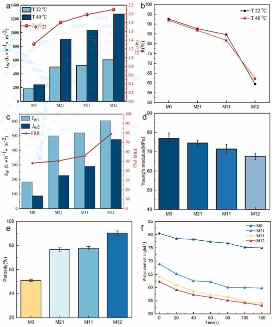 Comprehensive performance of PVDF/PVDF-g-PNIPAAm membranes: (a) water flux; (b) rejection rate; (c) antifouling performance FRR; (d) mechanical properties; (e) porosity; (f) water contact angle.