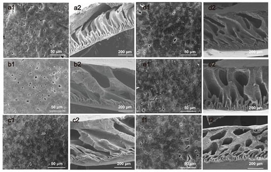 SEM photographs of the membranes: (a1–f1) the upper surfaces of pure PVDF membranes, PVDF/PVDF-g-PNIPAAm membranes, 0.25 wt%, 0.50 wt%, 0.75 wt%, 1.00 wt% GO content PVDF/PVDF-g-PNIPAAm/GO membranes; (a2–f2) the cross-section of the pure PVDF membranes, PVDF/PVDF-g-PNIPAAm membranes, 0.25 wt%, 0.50 wt%, 0.75 wt%, 1.00 wt% GO content PVDF/PVDF-g-PNIPAAm/GO membranes.