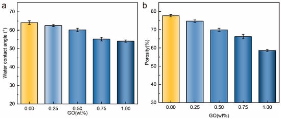 Figure 4 shows the test results of hydrophilicity and porosity of the membranes. Figure 4a shows the hydrophilic characterization of the membrane after adding GO. We found that the addition of GO significantly improved the hydrophilicity of the membrane surface. This is because graphene oxide is rich in hydrophilic groups. When the casting solution came into contact with water molecules, the GO attracted the water molecules, and eventually, the GO accumulated on the surface of the membrane. The amount and roughness of hydrophilic groups on the surface of the membrane were increased by graphene oxide, which improved the hydrophilicity of the membrane. However, in the characterization of membrane porosity, we found that the addition of GO containing rich hydrophilic groups caused the porosity of the membrane to decrease instead of increase (Figure 4b). Combined with the SEM photograph, after GO was added, the inside of the membrane changed from large pores to more small pores (Figure 3). This is due to the fact that the hydrophilic groups on the GO surface and the PNIPAAm chains are connected by hydrogen bonds into a tighter network structure. The dense hydrogen bond network impedes the exchange rate between the water molecules entering the membrane and the solvent. It promotes the formation of uniform small aperture finger pores.