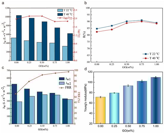 We also used the ratio of water flux at 40 °C and 22 °C to evaluate the temperature-sensitive performance of the membranes, and the addition of graphene oxide has little effect on the temperature response of the membranes (Figure 5a). At the same time, the membrane rejection rate also increases with the addition of GO (Figure 5b). Combined with the membrane microstructure, we believe that the increase in the retention rate is due to the decrease in the number of large pore sizes and the decrease in the overall porosity, which restricts the passage of macromolecular proteins. In the antifouling test, it can be seen that the addition of GO significantly improves the antifouling performance of the membrane, as shown in Figure 5c. This is due to the increased hydrophilicity of the membrane surface, which reduces the deposition of contaminants on the membrane surface. In addition, the mechanical properties of the membranes were measured by using tensile properties. The addition of GO increased the Young’s modulus of the membrane, which indicates that the structure of the membrane is tighter and can withstand more damage from external forces (Figure 5d). Overall, the addition of GO successfully achieved the antifouling and mechanical properties of the membrane. This is conducive to improving the service life of the membrane.