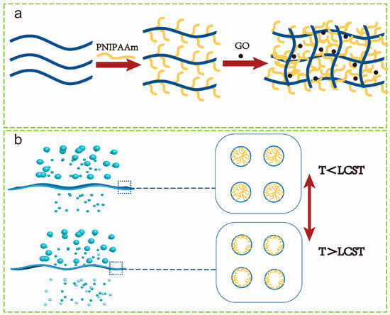(a) Schematic diagram of PVDF/PVDF-g-PNIPAAm/GO membrane formation; (b) schematic illustration of temperature response behavior.