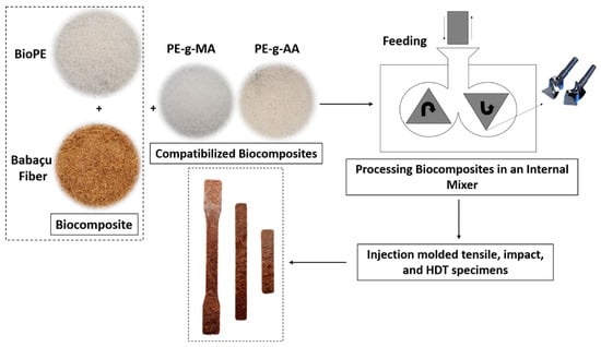 After melt blending, the biocomposites were ground in a Laboremus (Paraíba, Brazil) TP 150 knife mill. The ground biocomposites were vacuum-dried for 24 h at 60 °C prior to being injection molded using an Arburg Allrounder 207C Golden Edition machine (Radevormwald, Germany) to produce tensile (ASTM D638-Type I []), impact (ASTM D256 []), and HDT (ASTM D648 []) specimens. The injection molding apparatus temperature profile was 170/170/175/175/180 °C with a mold temperature of 20 °C. Figure 1 illustrates the processing scheme of the BioPE/BF biocomposites and the compatibilized biocomposites.