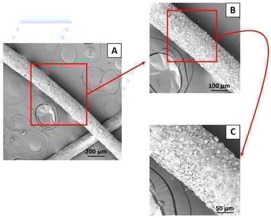 SEM images of the babassu fiber, with magnifications of 200, 500, and 1000×, respectively, are shown in Figure 4A–C. The babassu fiber has a long format and a diameter of approximately 170 µm, estimated using Image J software, version 1.51k. Figure 4C shows that the surface of babassu fiber is porous and rough, which is beneficial for improving interfacial adhesion, mainly when using suitable compatibilizers. Babassu fiber pores have an average size of around 12 µm. Pilla et al. [] observed that the porosity of wood fibers positively influences the properties of the material when using an ideal compatibilizer.