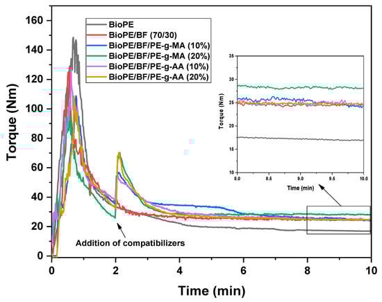 The rheometric curves for BioPE, the BioPE/BF biocomposites, and the compatibilized biocomposites with 10 and 20% compatibilizers are depicted in Figure 5. Using torque rheometry, it is possible to detect degradation, chemical interactions, and processing improvement [,,].
