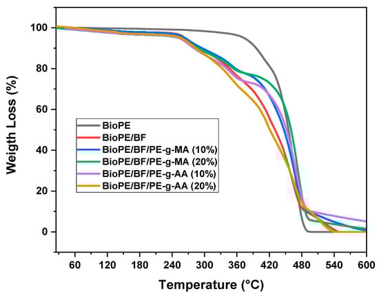 The TGA curves of BioPE, BioPE/BF, and the compatibilized biocomposites are displayed in Figure 6. BioPE has good thermal stability, with decomposition starting around 330 °C and ending around 490 °C. This indicates that for the processing temperature used in the production of materials, no significant thermal degradation should occur.