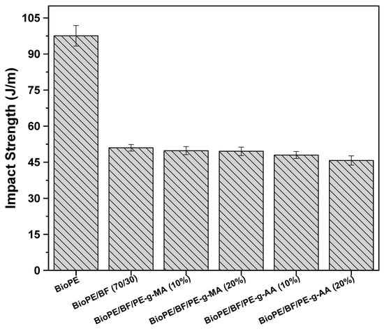 Taking into consideration the experimental error, no significant difference in impact strength, compared with the BioPE/BF biocomposite, was observed with the addition of 10 and 20% of either one of the compatibilizers. The elongation at break of all the biocomposites was similar, which explains the result obtained.