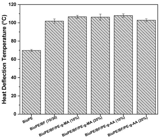 HDT is one of the most sought-after parameters by researchers, industry, and product designers, as it is directly related to a material’s ability to be used for a given application. The test consists of the temperature at which the tested material deflects 0.25 mm when subjected to mechanical stress and controlled heating [,,]. Figure 9 shows the HDT results of BioPE, the BioPE/BF biocomposites, and the biocomposites compatible with PE-g-MA and PE-g-AA.