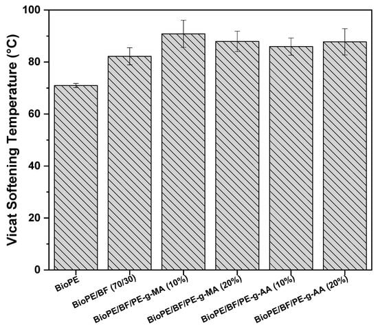 Another thermomechanical property that is widely explored in polymeric biocomposites and essential for the design of industrial applications is the Vicat softening temperature (VST). The VST is considered as the temperature where there is a penetration of 1 mm by a needle subjected to a specific load and temperature under controlled heating []. Figure 10 shows the results obtained from the Vicat softening temperature (VST) test for BioPE, the BioPE/BF biocomposites, and the compatibilized biocomposites.