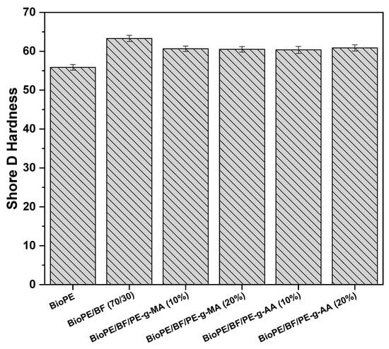Shore D hardness of BioPE, the BioPE/BF biocomposites, and the compatibilized biocomposites.
